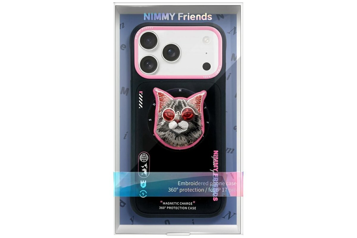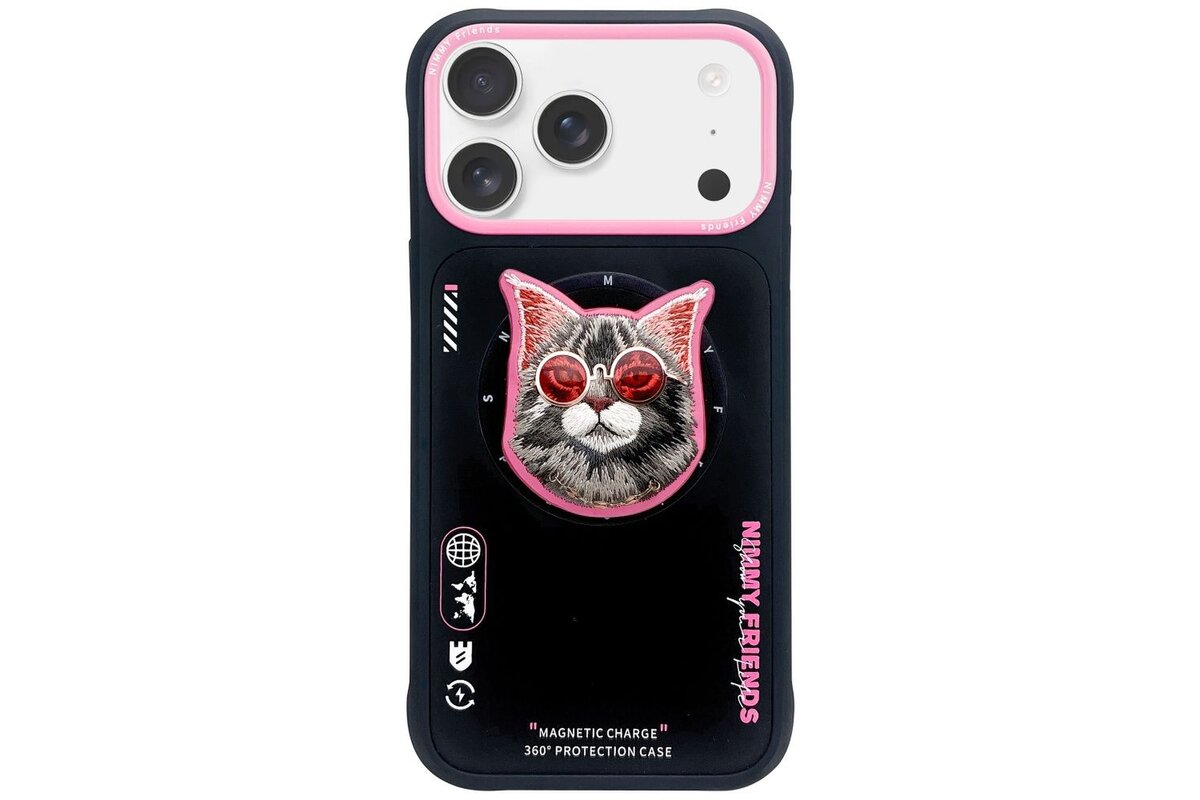 Puzdro Nimmy Friends iPhone 17, vzor mačka s okuliarmi - ružovo-čierne